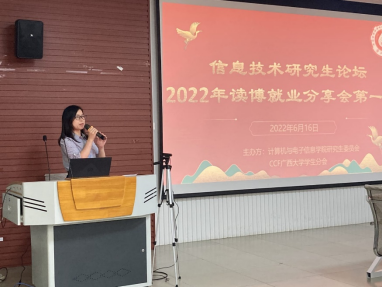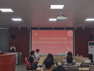 2022年6月16日下午,由太阳成集团tyc122cc主办、公司研究生会和中国计算机学会CCF太阳成集团tyc122cc员工分会联合承办的“信息技术研究生论坛——考博就业分享会(第一期)”活动于太阳成集团tyc122cc一楼报告厅举行。计算机与电子信息公司党委书记钟诚教授、公司团委副书记杨洋老师和兼职辅导员杜晓静同学参加现场活动,本次活动同时借助哔哩哔哩平台进行线上同步直播。