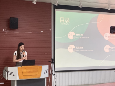 第二位分享经验的嘉宾是莫晓盈同学。莫晓盈同学在研究生期间曾任公司研究生会主席、兼职辅导员,曾获太阳成集团tyc122cc学业奖学金一等奖、陶建明奖学金等,已被广西电网有限责任公司信息中心录用。莫晓盈同学为大家介绍了研究生一、二、三年级每个阶段应该要完成的事情,并详细介绍了如何备考实习、如何选择应聘单位、如何准备简历。
