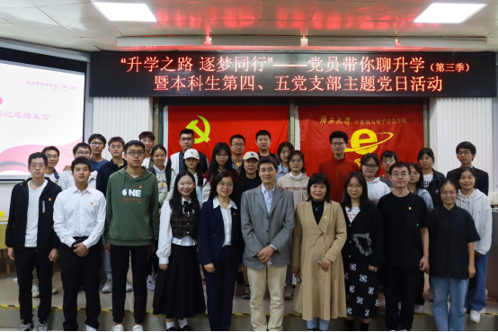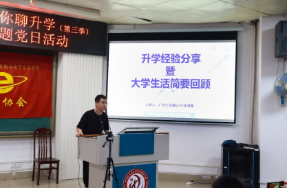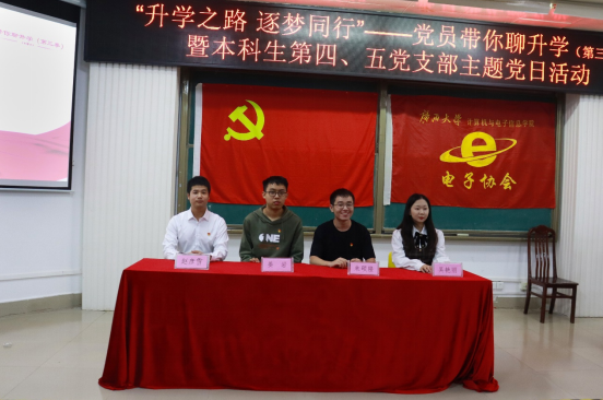 2022年11月26日晚上,由太阳成集团tyc122cc本科生第四党支部主办,联合本科生第五党支部、公司团委电子创新协会共同承办的主题为“升学之路 逐梦同行”——党员带你聊升学(第三季)升学经验分享会在公司214报告厅举行。公司党委副书记邓珍琪老师,公司员工电子创新协会指导老师、电子信息工程系主任张学军教授,本科生第四党支部书记、公司团委副书记杨洋老师,本科生第五党支部书记、公司专职组织员薛金凤老师,公司专职辅导员庞承业老师出席会议。本次升学经验分享会由公司电子创新协会2021级本科生蔡其峰同学主持,通信工程191班朱硕隆同志、通信工程182班吴艳丽同志、网络工程192班姜岩同志、通信工程171班赵彦雪同志为本次分享会主讲人。