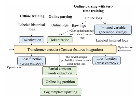 将半结构化日志转换为结构化日志的日志解析是智能日志分析的关键第一步。然而,由于新日志中会出现新的日志类型,现有的解析器在实际应用中仍不能令人满意,此外根据现有日志设置的解析器参数很难泛化支持新的日志类型,对此,该论文提出一种可变生成模仿策略来设计具有泛化能力的新的日志解析方法Log3T。Log3T分为离线训练和在线解析两部分。在离线训练阶段,Log3T将日志解析制定为二分类任务,利用标记的历史日志来训练Transformer编码器;在在线训练阶段,根据模型分配给单词的概率,从新出现的日志中提取最有可能的常数单词,在此基础上将新日志划分为不同的日志组,进而生成具有代表性的日志模板。为了增强模型泛化到新的日志类型的能力,Log3T进一步开发了一个包含测试时间训练的在线解析版本。在16个基准数据集上的实验结果表明,Log3T的解析准确率超过了当前的解析器,并能自动适应新日志类型。Log3T日志解析器软件在GITHUB开源(https://github.com/gaiusyu)。