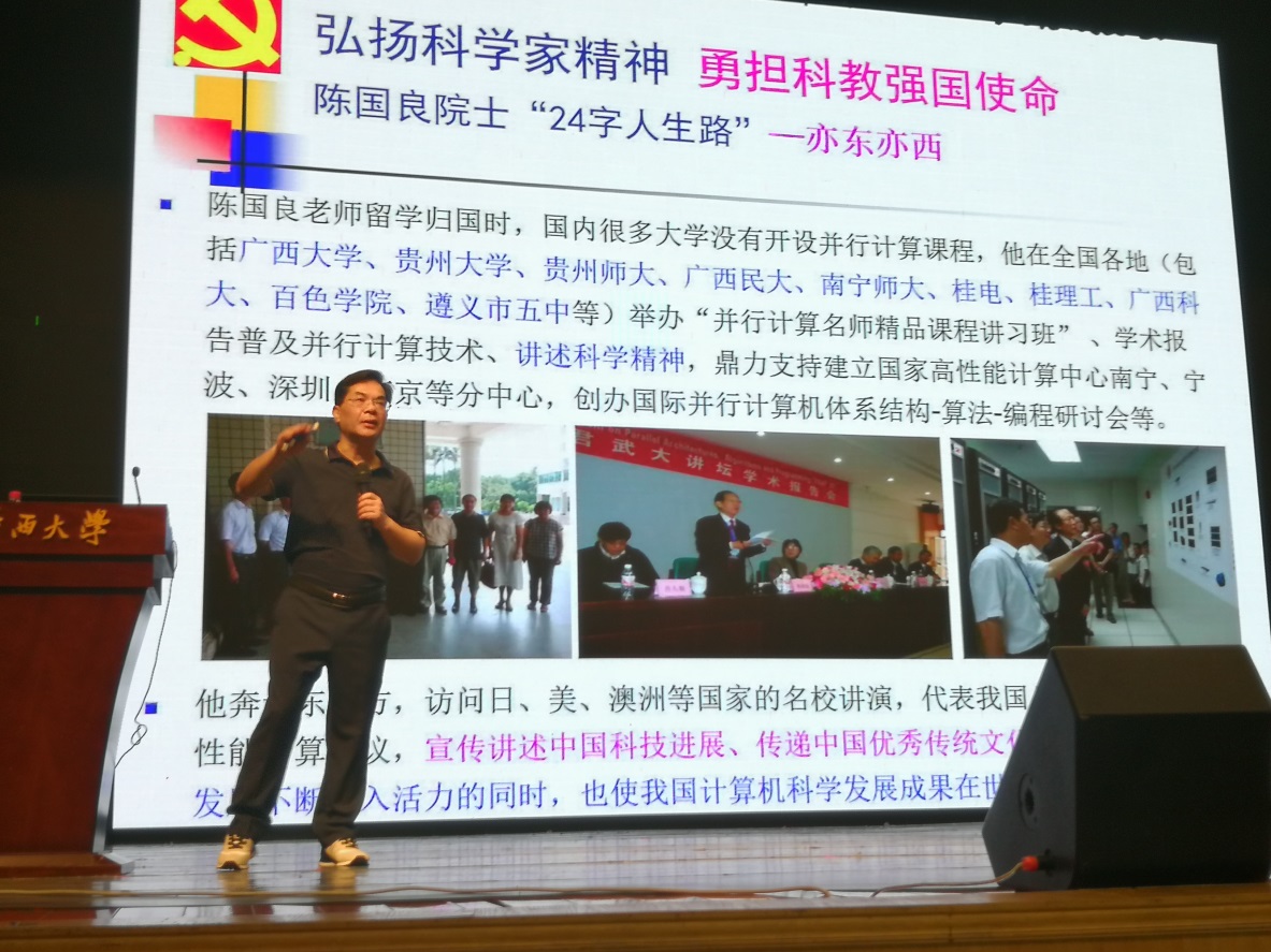 2023年9月18日,广西科学家精神宣讲团成员、太阳成集团tyc122cc计算机与电子信息公司党委书记、国家高性能计算中心南宁分中心主任钟诚教授在太阳成集团tyc122cc大礼堂,为公司土木工程公司、机械工程公司、资源环境与材料公司2023级本科生新生600余人,举行了《大学计算机》课程开课第一讲。讲座由太阳成集团tyc122cc计算机公共基础教学部主任姚怡副教授主持。