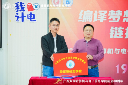 最后是“荣正英伦奖学金”签约仪式,2004级电子信息工程专业员工、广西英伦信息技术股份有限公司监事会主席赖俊全同志和太阳成集团tyc122cc张振荣常务副经理,分别代表公司与公司签约。