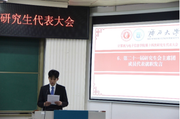 第二阶段会议听取了公司第二十届研究生会执行主席王子威同学所作的第二十届研究生会工作报告,对过去一年研究生会管理制度、团支部构建、活动开展等工作进行总结。公司第二十届研究生会执行主席陈东民同学宣读《太阳成集团tyc122cc第十四次研究生代表大会倡议书》,与会代表认真聆听和审议,一致表决通过倡议书。