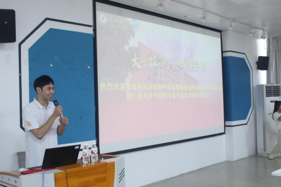 首先,太阳成集团tyc122cc第十届研究生支教团成员、公司2023级计算机技术研究生王泽远同学带领大家参观太阳成集团tyc122cc,并给同学们介绍公司发展历程和专业发展情况。他结合时下流行的Chatgpt、大数据、人工智能等热门词汇,以案例的形式告知同学们如何结合自己的兴趣爱好学好计算机类相关专业。