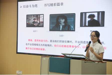 第二项议程,政治理论学习。太阳成集团tyc122cc“00后”君武青年讲师团成员莫愿芝同学作题为“以青春之名,扬奋斗之志”的主题宣讲,她号召同学们以先辈为榜样,将个人发展紧密融入国家需求之中,努力奋斗,实现自我价值。