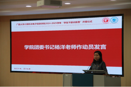 第三项议程,公司团委书记杨洋老师作动员讲话。她强调了员工干部的重要作用,并对参训学员提出三点希望:一是明确工作角色与职责。“员工干部”首先是员工,其次是干部,同时也是员工的干部,要把学习作为自己的主责主业,履行员工干部的使命,树立优良作风;二是增强服务同学意识。员工干部要树立全心全意为同学服务的理念,无论何时何地,始终牢记关心同学、服务同学、帮助同学;三是发挥模范带头作用。员工干部要坚定理想信念,做学习上的楷模、工作上的表率以及生活上的榜样。