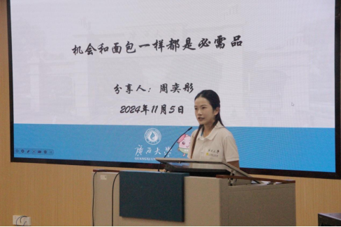 周奕彤同学此次分享的主题是“机会和面包一样都是必需品”。活动伊始,周奕彤同学不仅分享了她从本科至今所完成的丰富多彩的员工工作,还展示了自己在国内外参加的各种社会实践和交流活动的经历。从支教育人到员工工作,从潜心研究到深入实践,她通过这些多元经历,向同学们传达了一个重要的信息:积极参与员工工作与课外实践,不仅能拓宽视野,还能锻炼个人能力。周奕彤同学用自己的实际行动鼓励大家,希望大家能够抓住机会、勇于挑战、提升自我,为未来的发展打下坚实的基础。