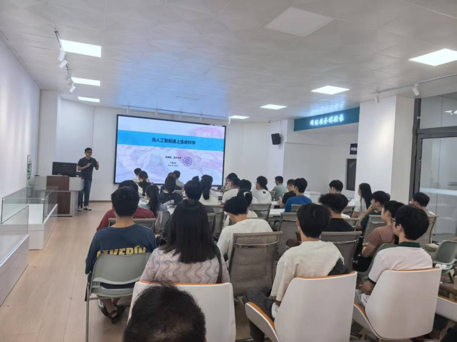 在报告的过程中,张强锋研究员首先回顾了过去多年间人工智能(AI)技术浪潮为科学技术领域带来的深刻变革,及其在社会、生活、经济各方面取得的突破性进展。他重点阐述了人工智能技术进入生命科学多个分支后所取得的重大成就,并以蛋白质结构预测为典型代表进行了深入分析。随后,张强锋研究员分享了他在运用人工智能方法研究DNA、RNA和蛋白质结构等方面的前沿工作和最新研究成果,其讲解高屋建瓴、深入浅出,引发了在场师生的浓厚兴趣。