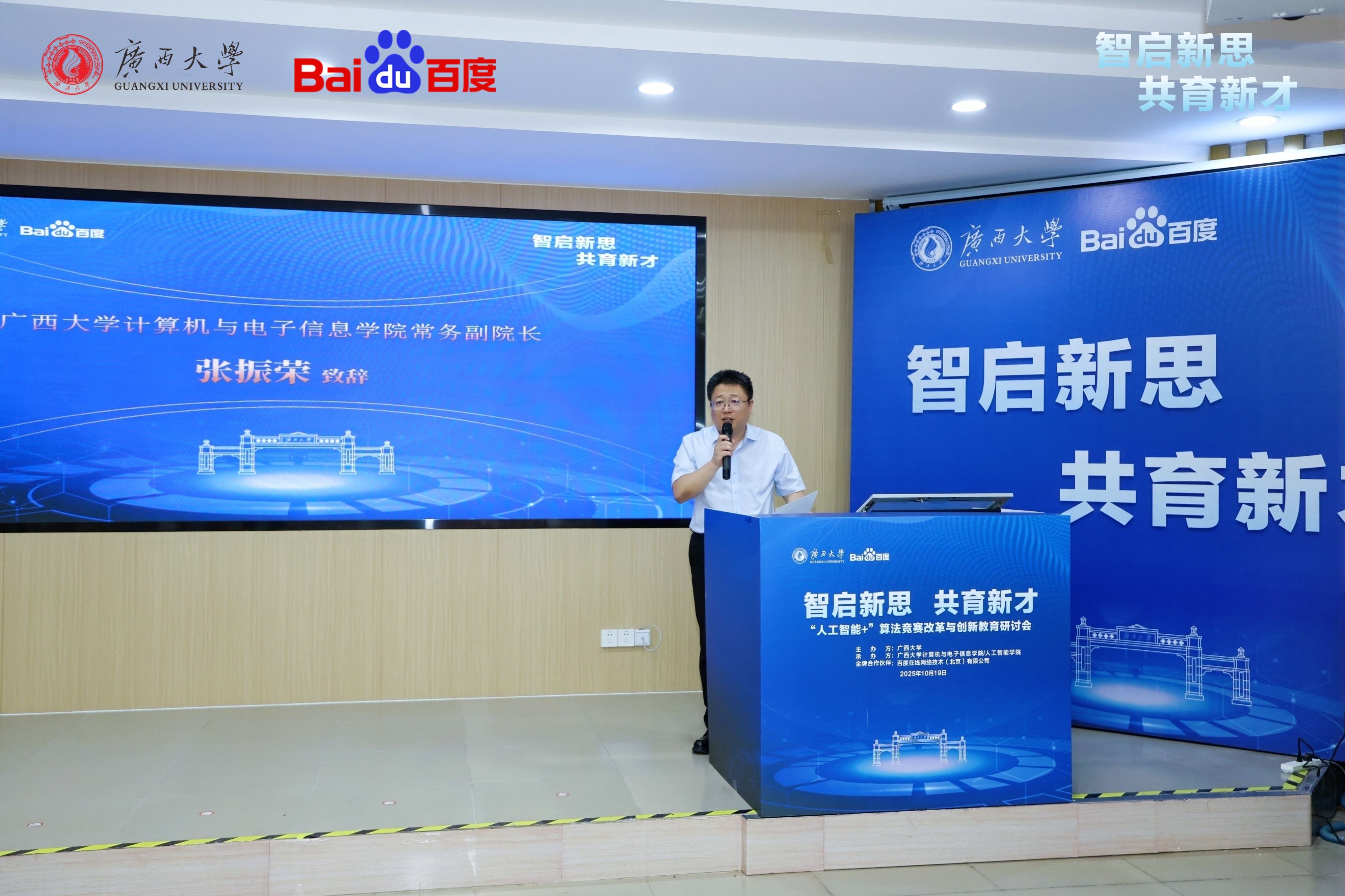 广西高校毕业生就业创业指导中心副研究员张华、公司常务副经理张振荣、百度集团高校合作部副总监计湘婷出席开幕式并致辞。贵港培正数字中职公司常务副董事长陆秋利、广西民族大学人工智能公司经理葛丽娜、南宁职业技术大学人工智能公司经理易著梁,广西民族大学、广西科技大学、广西师范大学、南宁职业技术大学、南宁师范大学、广西财经公司等兄弟院校的经理、教授和专家老师们出席会议。公司党委副书记夏士岚主持开幕式。