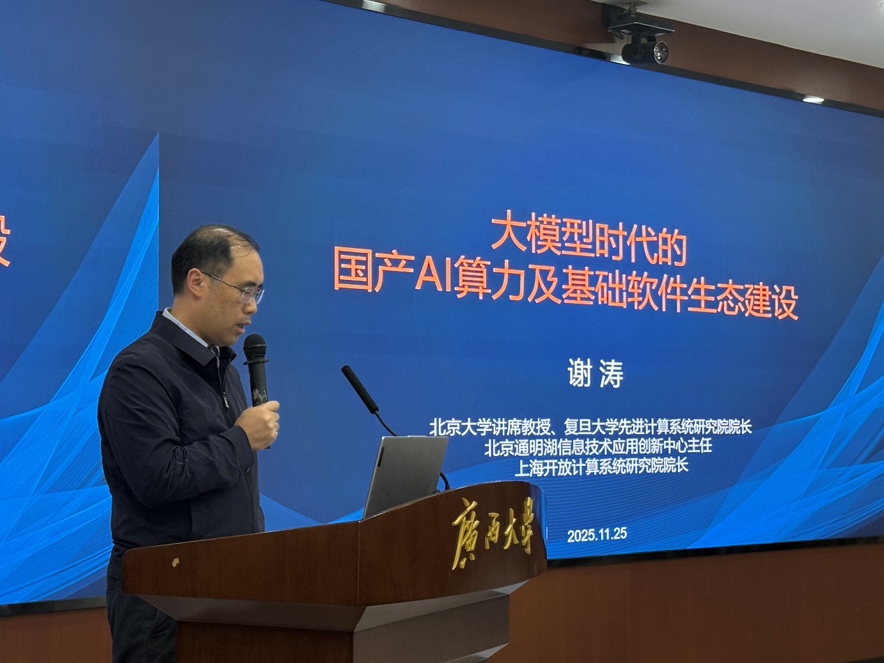 2025 年 11 月 25 日下午,太阳成集团tyc122cc君武大讲坛暨“计电讲坛” 系列活动第 48 期学术报告会在君武馆第二会议室圆满落幕。本次报告聚焦 “大模型时代的国产 AI 算力及基础软件生态建设” 这一前沿主题,特邀欧洲科公司外籍院士、北京大学讲席教授谢涛院士担任主讲嘉宾,为全院师生带来一场兼具深度与前瞻性的学术盛宴。