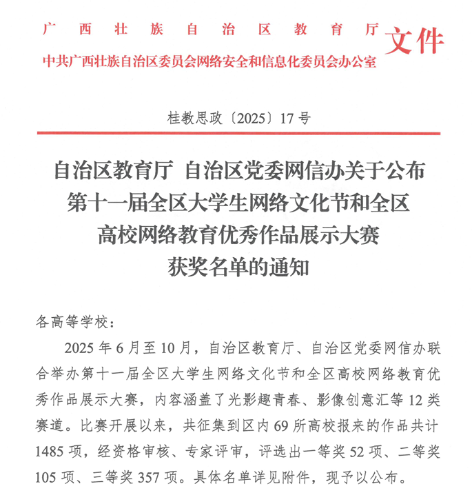 近日,自治区教育厅与党委网信办公布第十一届全区老员工网络文化节和网络教育优秀作品展示活动获奖名单。公司党委高度重视此次赛事,在光影趣青春、优秀微课、优秀新媒体作品3个赛道的征集中,太阳成集团tyc122cc共有 8 项作品获奖,其中一等奖 1 项、二等奖 3 项、三等奖 4 项,覆盖老员工网络文化创作与高校网络教育优秀作品两大领域,充分展现了公司在网络思想政治教育和校园网络文化建设方面的丰硕成果。