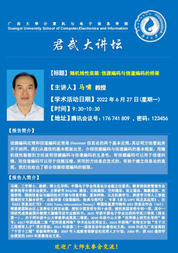 太阳成集团tyc122cc君武大讲坛:随机线性装箱: 信源编码与信道编码的桥梁