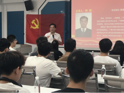 在交流环节中,同学们积极提问,钟诚老师耐心解答。他向同学们讲述了自己作为一名党员、一专业教师、广西首批科学家精神宣讲团成员持续学习、不断实践的初心,并以此激励青年员工对科学的热爱和追求;同时,他向同学们提出了3个方面的建议:一是在政治思想上,要坚定不移听党话跟党走,以服务人民为自我目标;二是在学习科研上,要勤奋钻研,以勤补拙,积极参加研讨、学术会议交流,以了解最新学科发展动态和研究热点,善于思考,富于联想持之以恒,勇于实践;三是努力养成好的生活习惯,以多种方式加强身体素质锻炼,保持心态阳光、昂扬向上的精神状态。