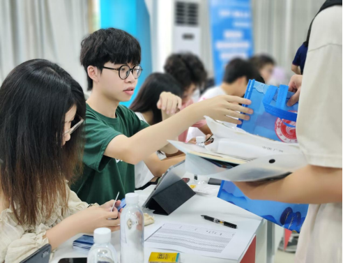 新生注册报到现场的工作人员以饱满的热情迎接新同学