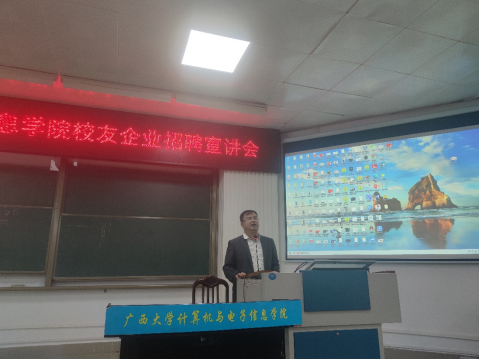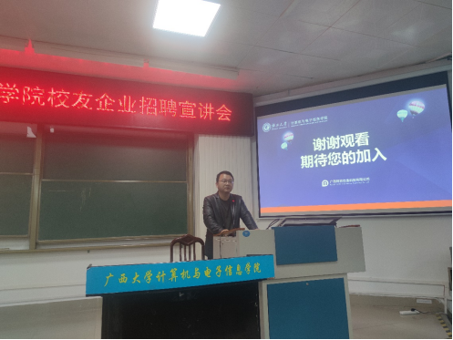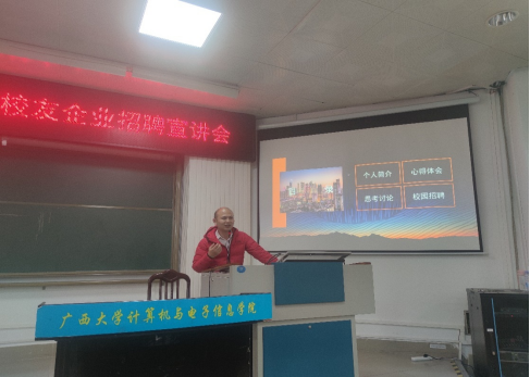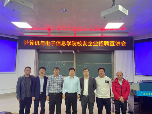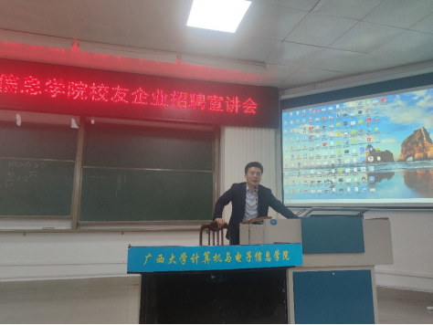 2021年12月16日下午,太阳成集团tyc122cc与员工企业合作,在公司214报告厅召开员工企业招聘宣讲会,员工企业广西尚信品科技有限公司、广西迅驰信息科技有限公司、广西优乐俊智能机器人有限公司和广西码农信息科技有限公司、以及广西天海信息科技有限公司等5家企业到公司开展2022届毕业生招聘宣讲。